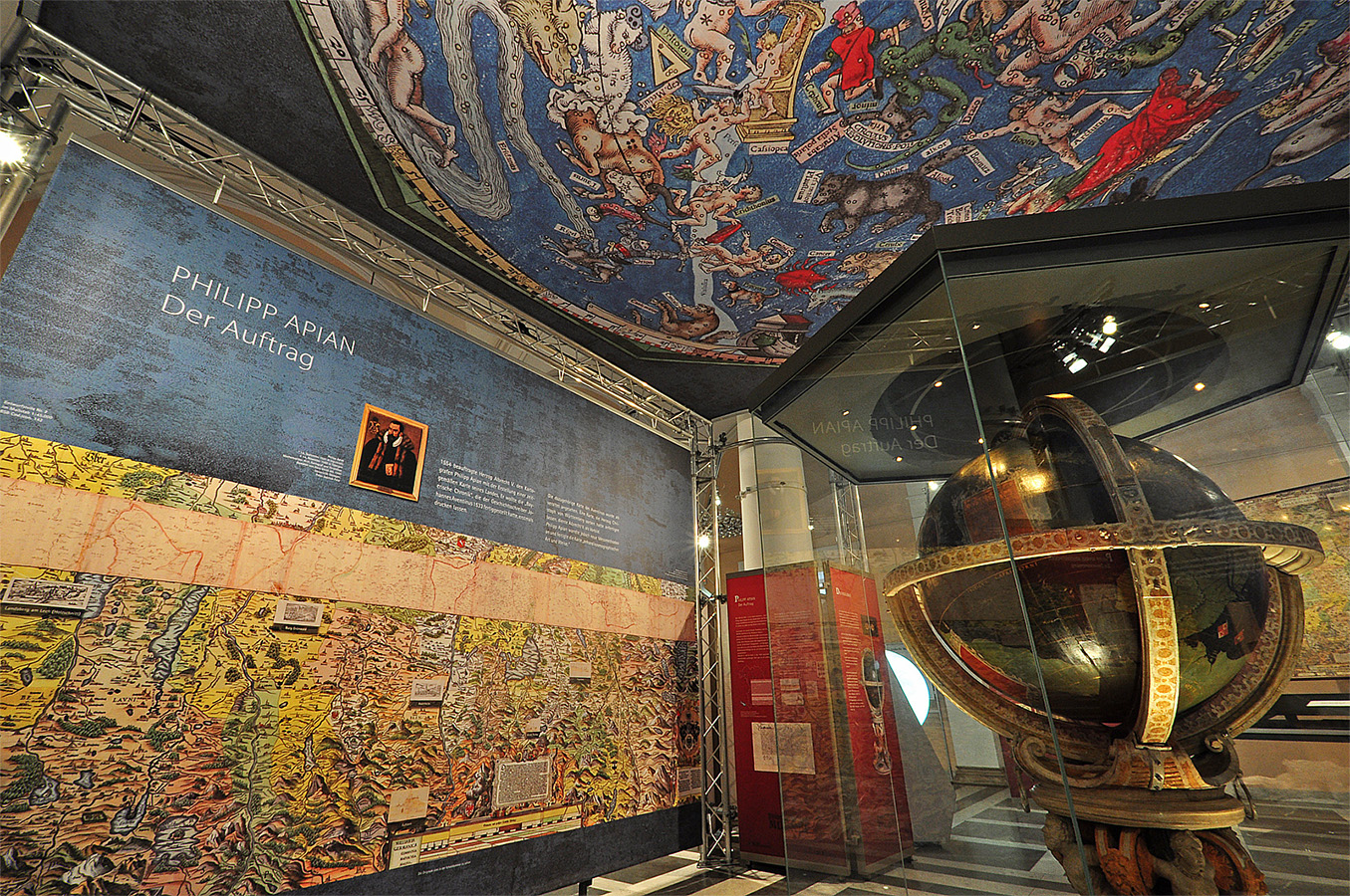 links: Ölbild mit Goldrahmen. Halbfigur Philipp Apian von 1590 in zeitgenössischem Gelehrtengewand: schwarzer Talar mit Pelzkragen und Halskrause aus weißem gestärktem Leinen. Apian hält ein Buch in der linken Hand. Schriftzug oben rechts: Philippus Apianus Medinicinae Doctores et Professor Mathem 1590. links oben: Wappen, das mit dem Bild der Großen Karte zusammenhängt. Rechts: Philipp Apians Große Karte hängend über dem Treppenhaus der Ausstellung.